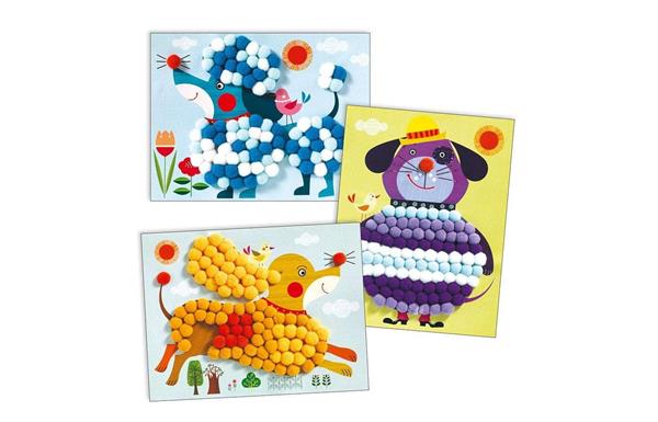 Maak mooie aaibare kunstwerken! Kleef de pompons op de voorbeeldkaarten en geef de kale honden een superzachte vacht. Deze activiteit is super leuk en geeft steeds een prachtig resultaat.