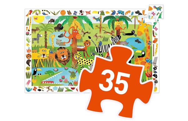 Prachtige puzzel van 35 stukken in thema 'de jungle'. De puzzel is gemaakt van dik karton en zit in een vrolijke stevige doos. Als je klaar bent met puzzelen, kan je als een echte detective op zoek gaan naar de voorwerpen die verstopt zitten. Wat je allemaal kan zoeken, staat afgebeeld op de rand van de puzzel. Wat doet de aap? Waar is de krokodil?