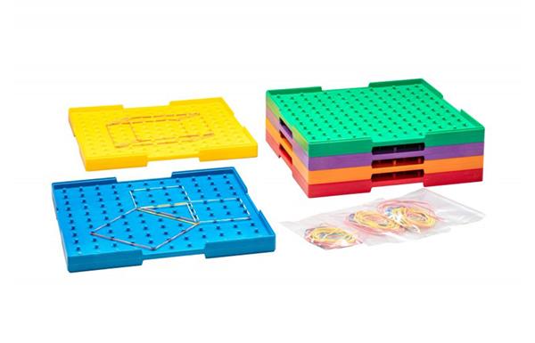 Met deze geo-borden kan je het ruimtelijk inzicht en de oriëntatie stimuleren terwijl je tegelijk de fijne motoriek oefent. De kinderen plaatsen de elastiekjes over de pinnen en maken zo de voorbeelden na of bedenken zelf figuren.