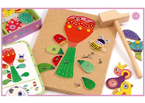 Met dit spelbord kunnen kinderen hun eigen tuinen en bloemen bouwen door met de hamer en spijkers de houten vormen aan het spelbord te bevestigen. Ze kunnen de meegeleverde voorbeeldkaarten namaken of een eigen creatie maken. Alle vormen zijn mooi geïllustreerd in het thema 'in de tuin'. Na het spelen kan alles worden opgeborgen in een mooie houten doos. Uiteraard wordt hier ook de fijne motoriek gestimuleerd.