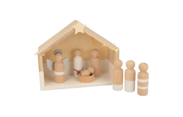 Ontwerp je eigen kerststal met deze doe-het-zelf set bestaande uit een houten huisje, 6 grote rechte peg dolls, een houten ronde bak als kribbe en een kleine ronde peg doll als Jezus. De ster, vleugels en aureool van triplex dien je nog zelf te verlijmen. Beschilder de peg dolls met verf of kleed ze aan met vilt en maak zo jouw persoonlijke kerststal die altijd precies bij je persoonlijke stijl past.