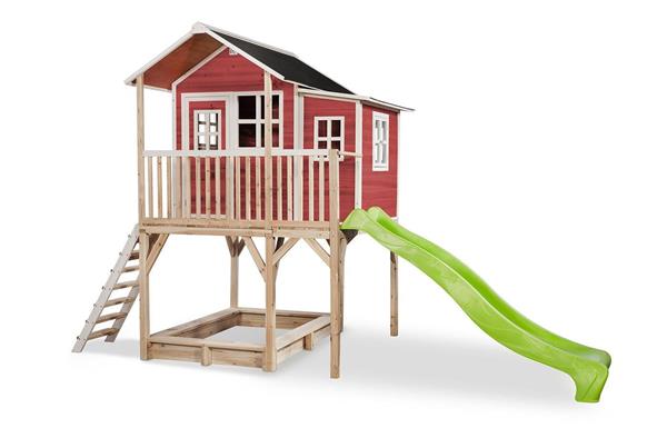 In dit houten speelhuis hoeven de kinderen zich geen dag te vervelen. Dit huis staat op een extra hoog plateau en heeft een aanbouw en een lange glijbaan. Door het hogere frame kunnen kinderen van alle leeftijden ook in de zandbak eronder spelen. Klim omhoog via het trapje en glij naar beneden via de coole glijbaan. Eenvoudig in elkaar te zetten vanwege de vooraf gemonteerde onderdelen.