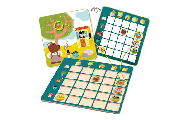 Kijk op de opdrachtkaart en vind de positie van de 5 dieren in verhouding tot de 5 voorwerpen, bijvoorbeeld de kikker zit in de emmer.  Leg daarna het dier op de juiste plaats in de houten matrix en controleer op de achterzijde of je het juist hebt gedaan. Een eenvoudig, grappig spel om te oefenen op ruimtelijke oriëntatie maar ook bijvoorbeeld om zinsbouw te oefenen.
