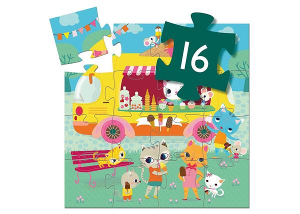 Puzzel van 16 stukken in het thema 'ijskar'. De ijskar is er, de katten krijgen een traktatie! Deze prachtige puzzel wordt geleverd in een mooie doos in de vorm van een ijskar. Een ronddraaiend ijsje brengt het busje tot leven. Deze puzzel wekt de fantasie op voor het bedenken en vertellen van verhalen.