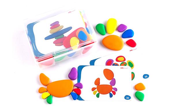 Inclusief 36 steentjes in 6 maten en 6 kleuren en 20 gedifferentieerde opdrachtkaarten.