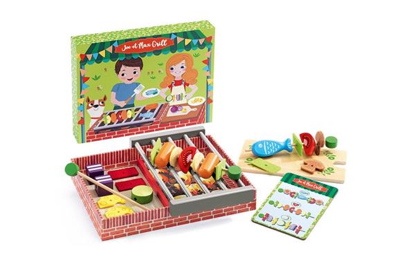 1 houten snijplank 3 houten spiezen 1 menukaart 20 ingrediënten (hout en vilt) 1 houten opbergkist