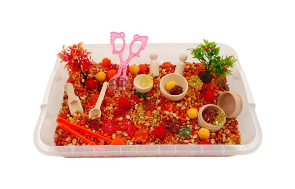 Sensory Play Tray - herfst - maïs: - plastic box met deksel (afm. 27 x 35 x 9 cm) - 1 kg gekleurde maïs - 1 houten scooper - 1 houten lepeltje - 1 handy scooper - 2 houten kommetjes - 1 houten doosje + deksel - 2 peg dolls - 1 pincet - 2 herfsttruiken - 34 transparante herfstbladeren en vruchten - 10 transparante stenen in herfstkleuren - 15 pompons in herfstkleuren
