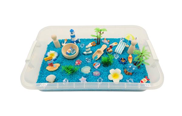 Sensory Play Tray - bij - speelrijst: - plastic box met deksel (afm. 27 x 35 x 9 cm) - 1 kg blauwe rijst - 1 houten schepje - 1 houten kommetje - 2 peg dolls - 9 plastic blauwe stenen - 2 waterplanten - 2 palmbomen - 2 zijden bloemen - 1 ligstoel - 1 slipper - 1 paar slippers - 1 parasol - 3 plastic schelpen - 1 vuurtoren - 1 anker - 1 dolfijn - 1 vis - 1 zeester - 1 krab - 2 zeilboten - 1 stuurwiel - 2 visgraten - 1 strandemmer met schelpen - 1 kruik met water - 1 wegwijzer