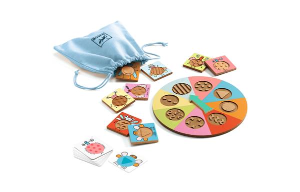 Tastbaar ontdekkingsspel. Een tastspelletje om verschillende kriebeldiertjes te leren kennen. De speler grijpt met zijn hand in de zak om er op de tast een vormpje te vinden dat overeenkomt met de door de pijl aangewezen categorie.