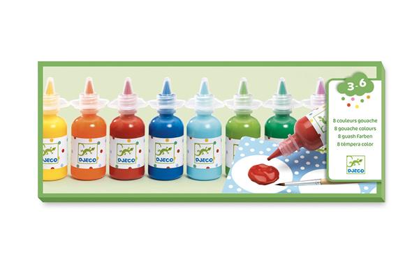 Set van 8 kindvriendelijke flesjes met dekkende waterverf of plakkaatverf. De flesjes zijn onbreekbaar en hebben een handige doseertuit. Er zit ook een mengbordje en een penseel bij zodat je nog meer kleuren kan maken. Alle kleuren om een mooi schilderij te maken!